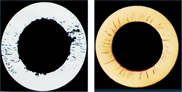 首先在管壁内产生空洞,空洞几乎都在碳化物与基体的交界处形成。随蠕变的进行,空洞增加并沿碳化物连接起来形成微裂纹。随后,裂纹先向内侧,后向外侧扩展,在炉管内压及热应力等作用下,终导致炉管开裂。
