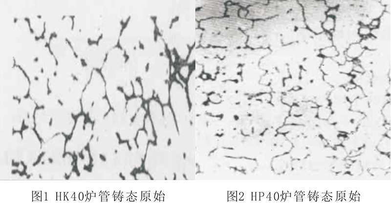 HP40耐热钢其Ni含量比HK40提高了15%,目的是为了提高炉管在高温区的性能。Ni 含量增加也提高了抗氧化和抗渗碳能力,减少了碳在奥氏体中的溶解度。在含碳量相同的情况下,HP40比HK40炉管的共晶碳化物多,故使蠕变断裂抗力提高。