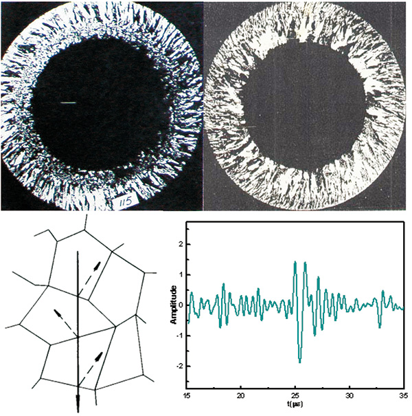 高温炉管是离心铸造的奥氏体不锈钢,料晶粒粗大、表面粗糙。超声波检测大晶粒奥氏体不锈钢遇到的两个主要问题是粗大的树枝状晶和晶粒的择优取向,由于声阻抗的变化,晶界散射使较大部分能量耗散在晶界上,常规的超声检测方法是无法进行检测的。